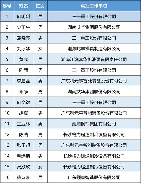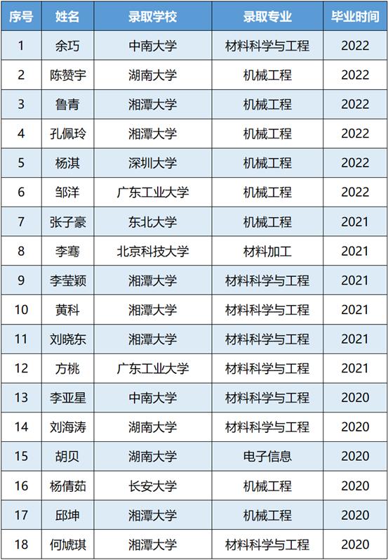 本专业毕业生就业率一直保持在98%以上且部分毕业生被华为、三一重工、比亚迪、中联重科、格力等知名企业录用,主要从事数字化成形装备、智能制造、新能源汽车、电子等行业的设计制造、质量控制、生产管理等岗位工作,产业市场巨大薪资待遇处于行业中高水平。毕业生考研录取率多年来保持25%以上,名列全校前茅,多数同学被中南大学、湖南大学、北京科技大学、湘潭大学等“双一流”知名高校录取。
